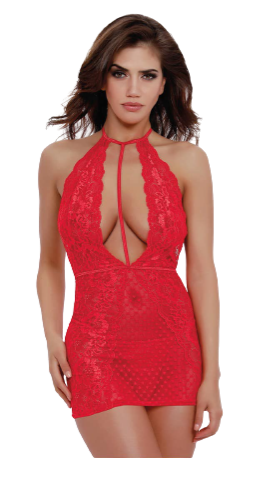 Lace chemise with choker neck band and plunging v-front.