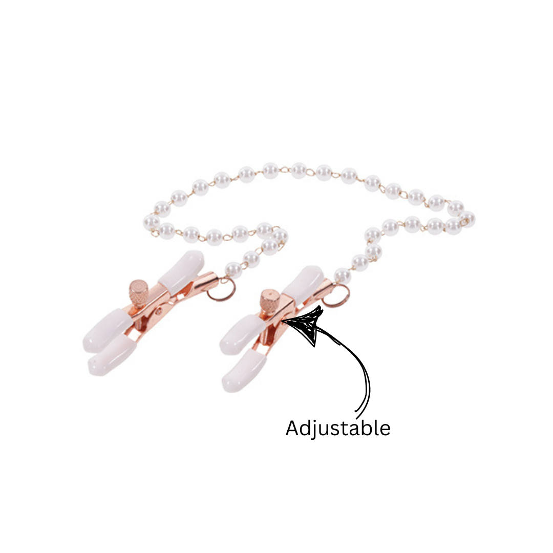 Take a tastefully tantalizing step into deeper sensations with the Peaches n’ CreaMe Pearl Nipple Clamps. Explore delicious sensitivity right where you want it most with dual adjustable clamps in stunning rose gold with pearl accents. White rubberized tips add a playful pop of color to your play and keep the clamps from slipping as you tease and pull your lovers chain, bringing intense feelings to their body.