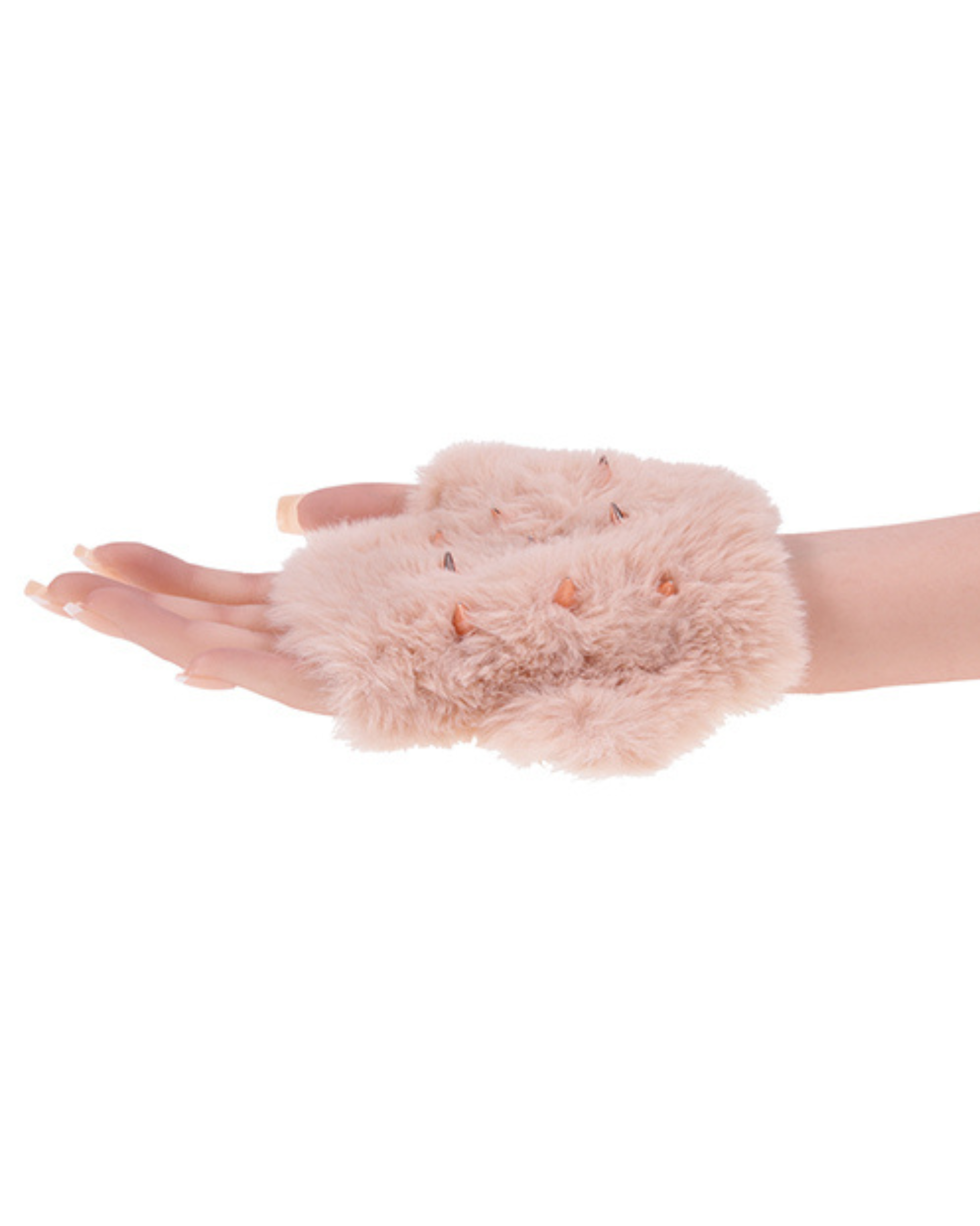 The palm features a lush layer of faux fur that dances across the skin, paired with gleaming rose-gold spikes for a bold, uninhibited strike when the mood shifts. The shimmery, stretch Lycra back contours comfortably to your hand, while dedicated pinky and thumb slots keep the glove secure during every sultry session.