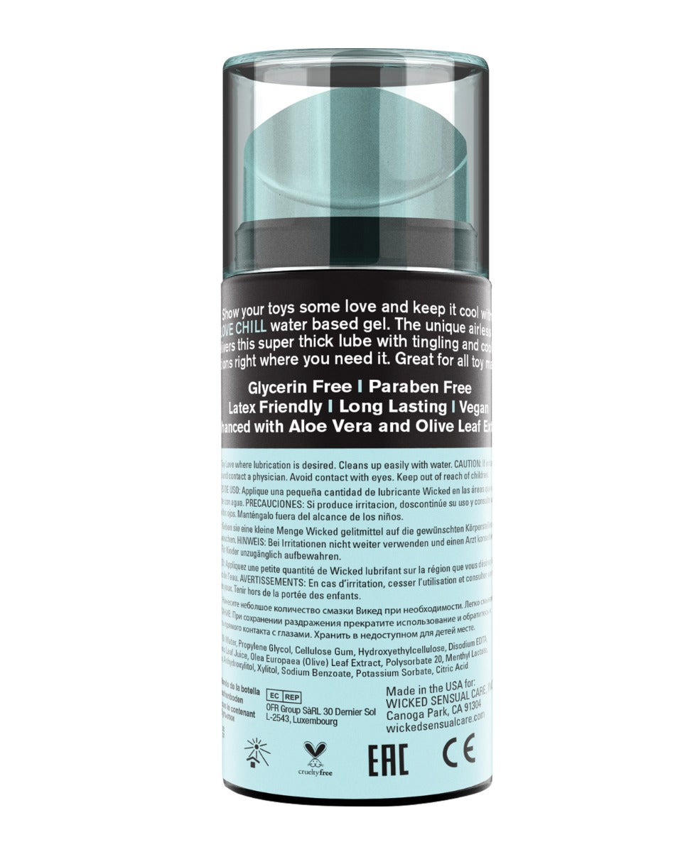 Enhance your toy play experience with Wicked Toy Love Chill. Let the gentle cooling sensation give you goose-bumps of pleasure. This unique water-based personal lubricant is developed specifically for use with your favorite intimate devices. The jelly-like texture is designed to stay where you put it and not run down the sides or off the edges of your toy. Super slick and long-lasting, Toy Love Chill provides that little extra glide for all types of toys and toy materials along with an added gentle chill sensation.